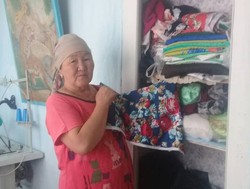 Тоңдук З.Иязбекова айылдаштарына түрдүү кийимдерди тигип берет
